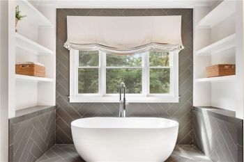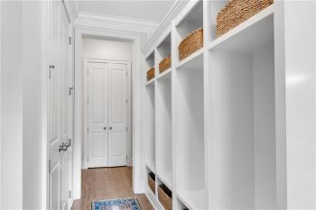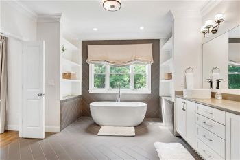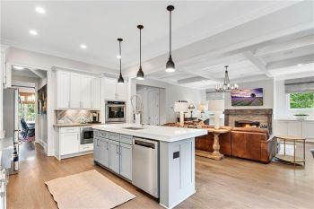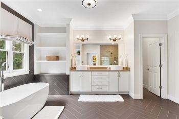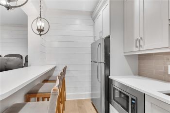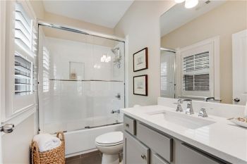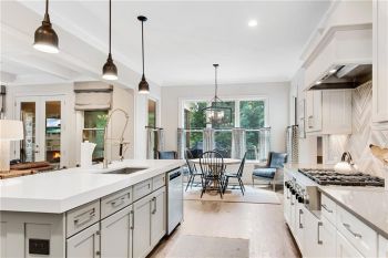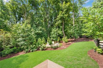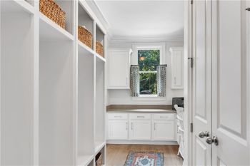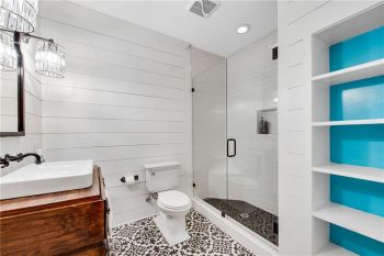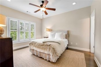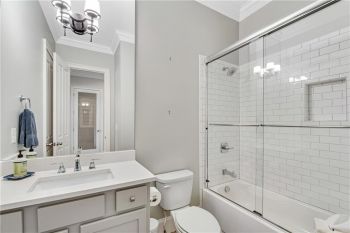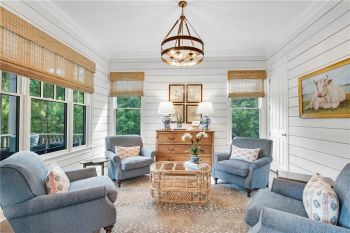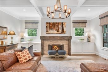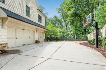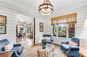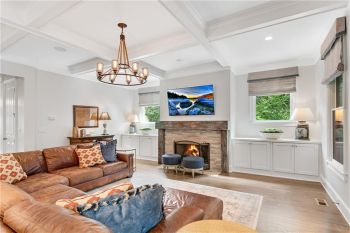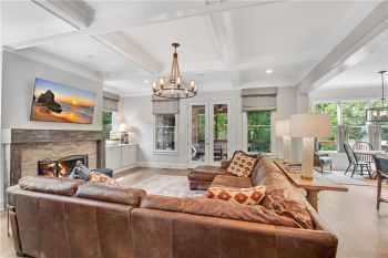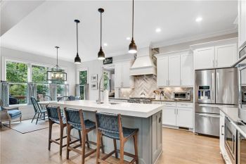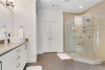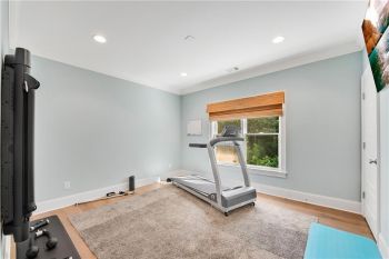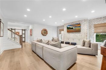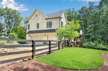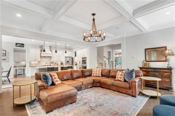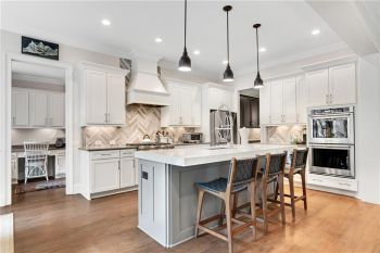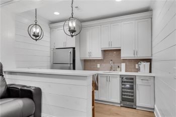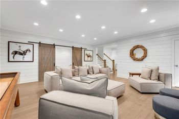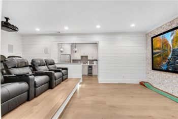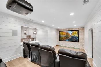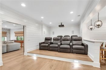 Prepare to be astounded by the fully finished terrace level, which boasts a designer farmhouse-style media room complete with plush seating, a well-appointed wet bar, a cozy brick-walled living area, an office space, and a guest suite with charming brick accents throughout.