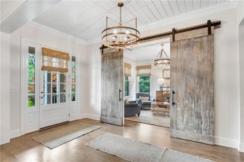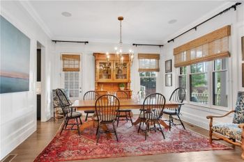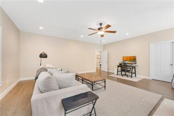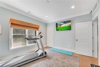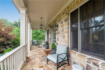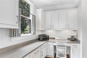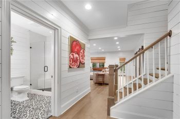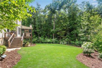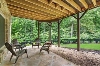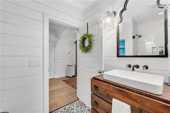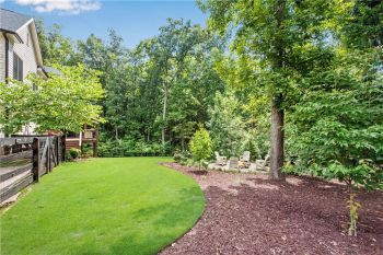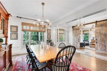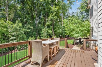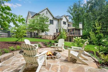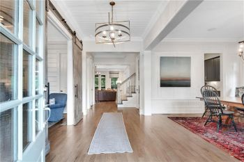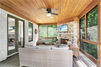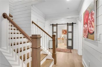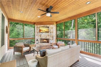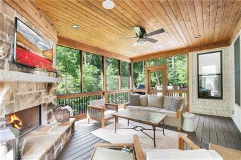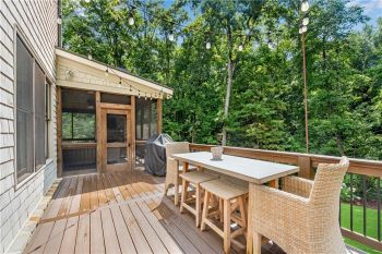 Step inside, and you'll find a warm and inviting foyer along with a formal dining area enhanced with picture frame trim work, while the study/bedroom on the main floor features eye-catching wood barn doors, shiplap walls, and a full bath. The open floor plan is tailor-made for entertaining, with the gourmet chef's kitchen seamlessly flowing into the fireplace-equipped living room, a sunlit breakfast nook, and an expansive covered/screened patio featuring its own stone fireplace. An ample outdoor deck offers space for dining and grilling, all overlooking a private backyard. Beyond the existing fence, the land extends into the tranquil woods. The upper level of the house boasts 4 bedrooms and a bonus space/study area with a built-in desk, conveniently adjacent to a spacious bonus room that could serve as an additional bedroom or playroom.