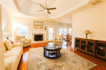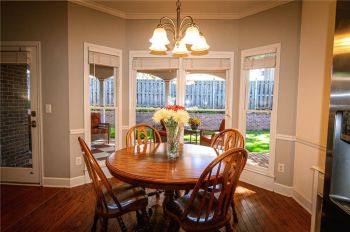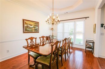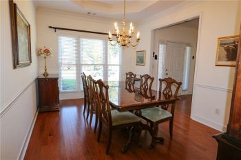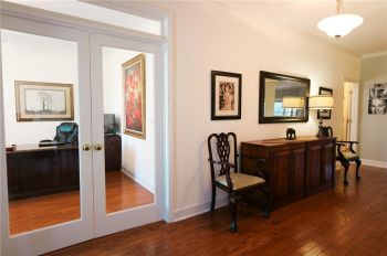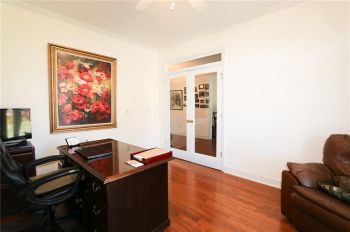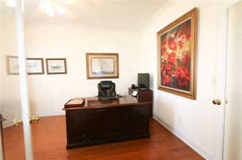 Working from home? This residence boasts a dedicated office space adorned with glass doors for quiet productivity. On the other side, an elegant formal dining room awaits, ideal for hosting memorable gatherings and celebrations.