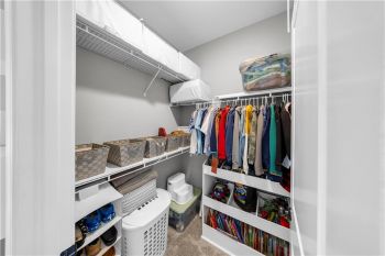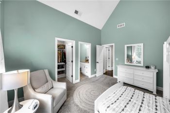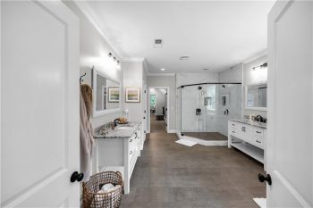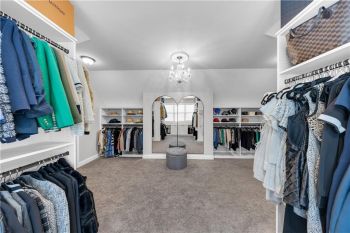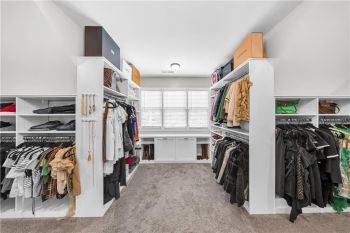 The primary suite is a private sanctuary, showcasing a spa-inspired bath with dual vanities, a soaking tub, and a dual-head glass shower, along with an expansive California custom walk-in closet filled with natural sunlight.