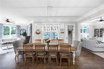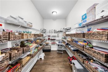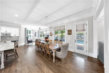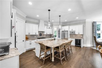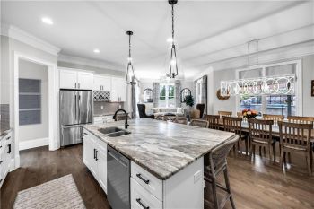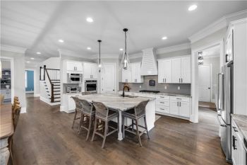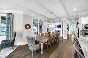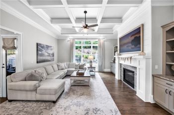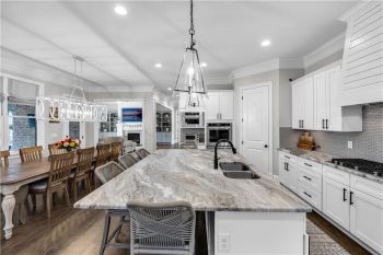 The heart of the home is a gourmet chef’s kitchen featuring custom cabinetry, stainless-steel appliances, granite countertops, a large walk-in pantry, and a spacious center island with pendant lighting and breakfast-bar seating. The kitchen seamlessly opens to the fireside family room, accented by a coffered ceiling and an abundance of natural light—creating an inviting space for entertaining and family gatherings.